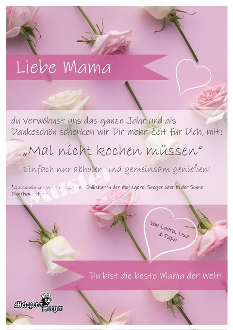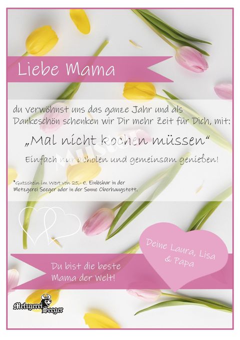 Ihren Gutschein erhalten Sie, indem Sie das Bestellformular ausfüllen und absenden. Der fertig ausgedruckte Gutschein liegt gerollt mit Schleife, spätestens am Samstag, den 08.05. bis 12.30 Uhr zur Abholung an der Theke