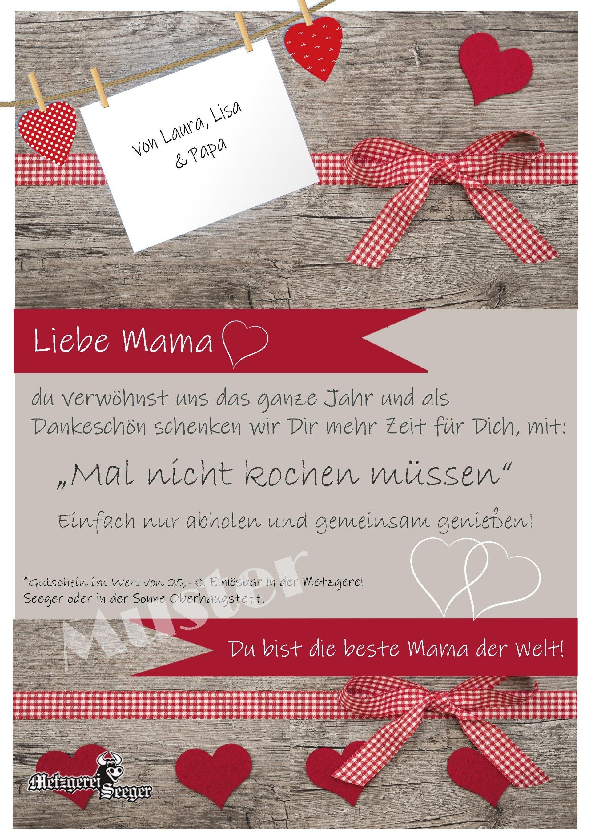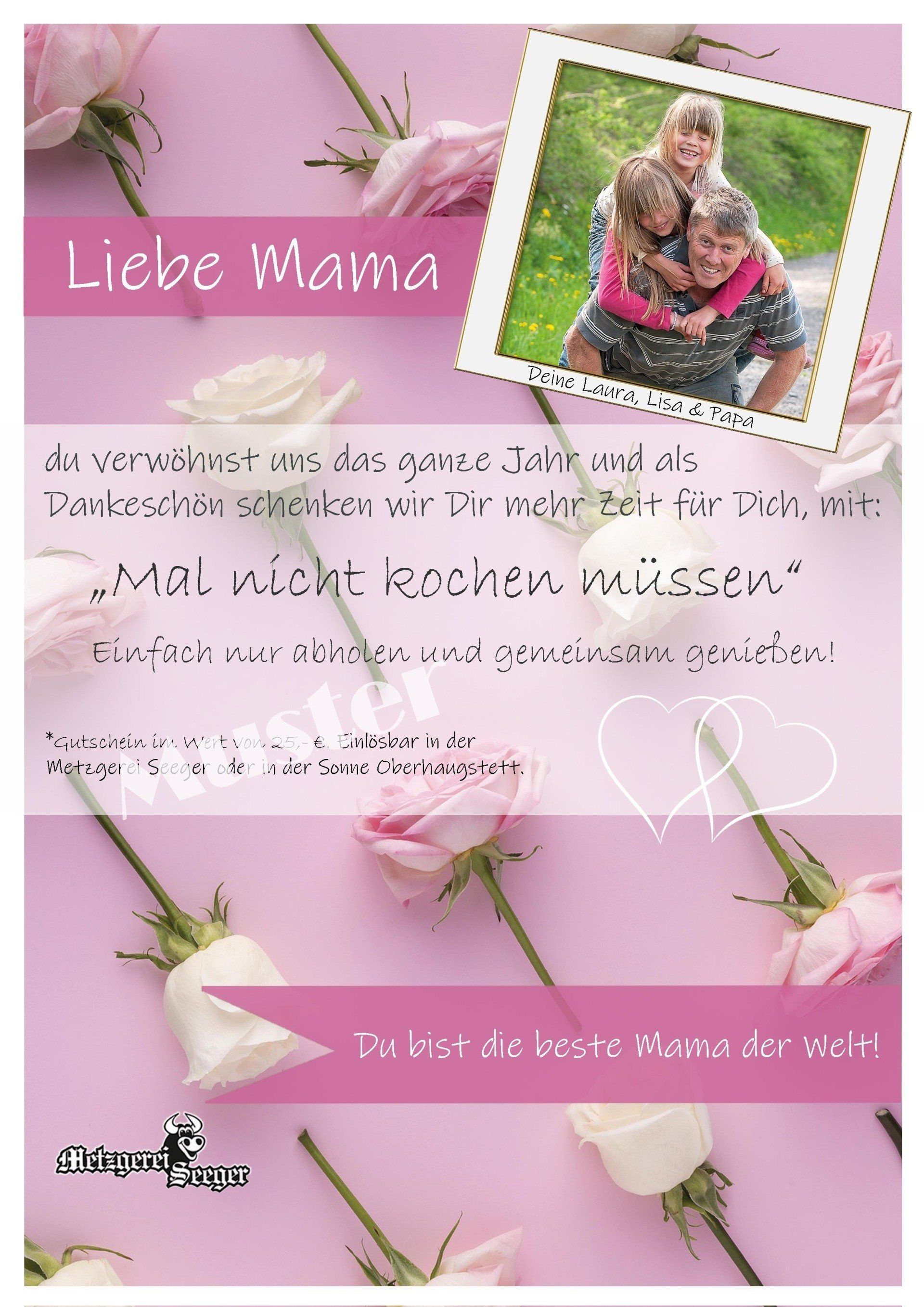 Ihren Gutschein erhalten Sie, indem Sie das Bestellformular ausfüllen und absenden. Der fertig ausgedruckte Gutschein liegt gerollt mit Schleife, spätestens am Samstag, den 08.05. bis 12.30 Uhr zur Abholung an der Theke